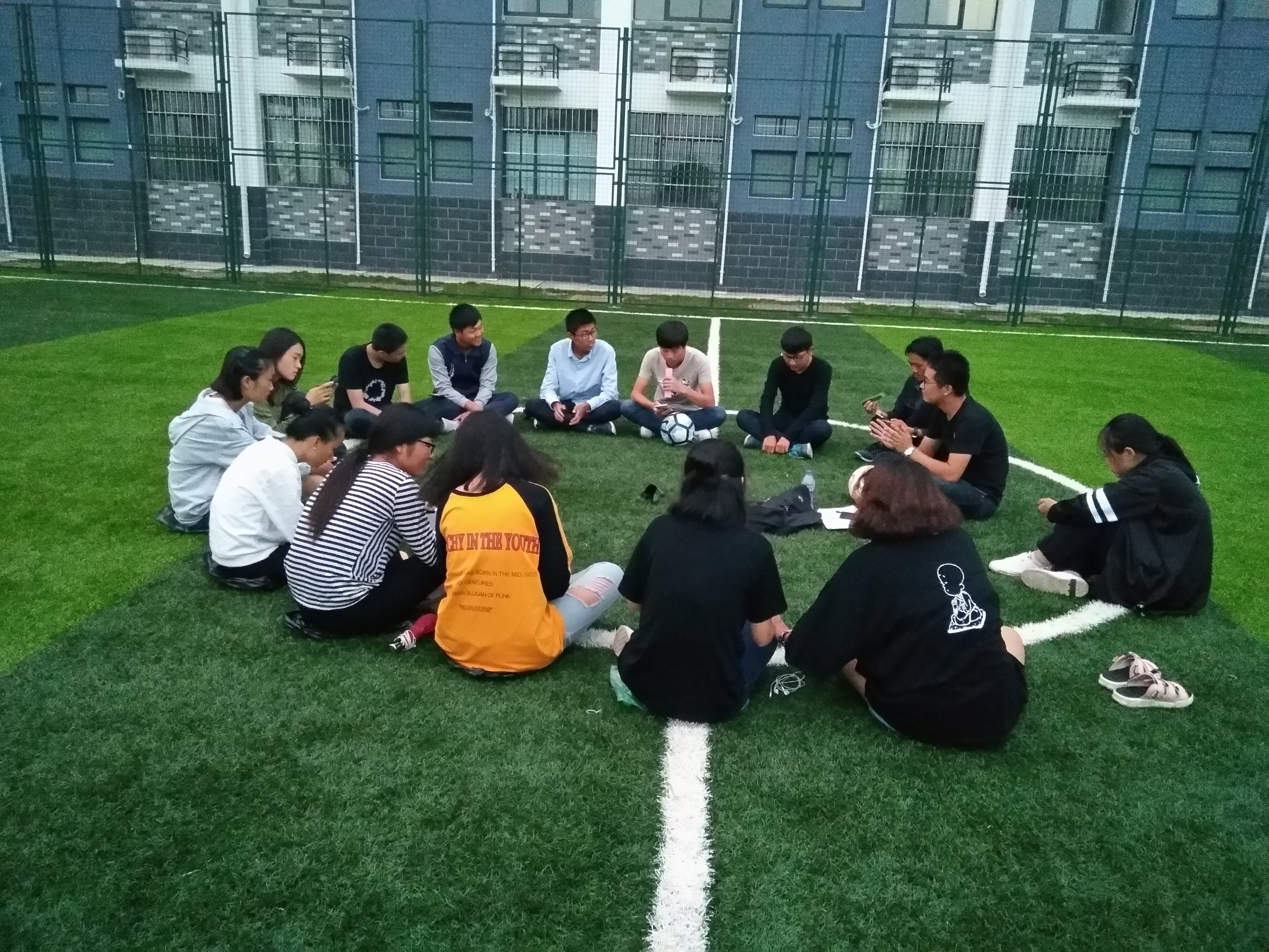 2017年10月1日傍晚,在7号楼下的足球场中央,二十余人围成的一个圈,大家在轮流自我介绍。走进一看,原来是管理系和机电的17级新生辅导员张老师组织国庆节没有回家的学生在此聚会。