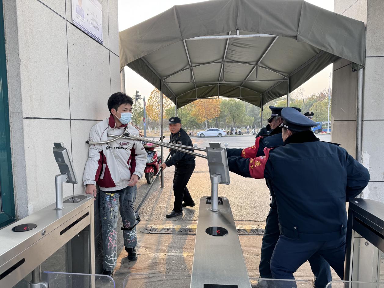 随着总指挥祝杰向两校区同步下达“演练开始!”指令,一男子不听询问直冲校门,保安人员迅速启动紧急预案,第一时间与“歹徒”交涉、周旋,制止其靠近学生,同时向学校后勤保卫处汇报及拨打报警电话并向全校师生发出预警信号。面对危险的“歹徒”,保安人员利用手中的各种防暴工具,奋力与“歹徒”周旋搏斗,阻止“歹徒”冲进校园。通过短短几分钟时间便将“不法分子”制服,警报随之解除,学校很快恢复了正常的秩序,演练活动圆满结束。