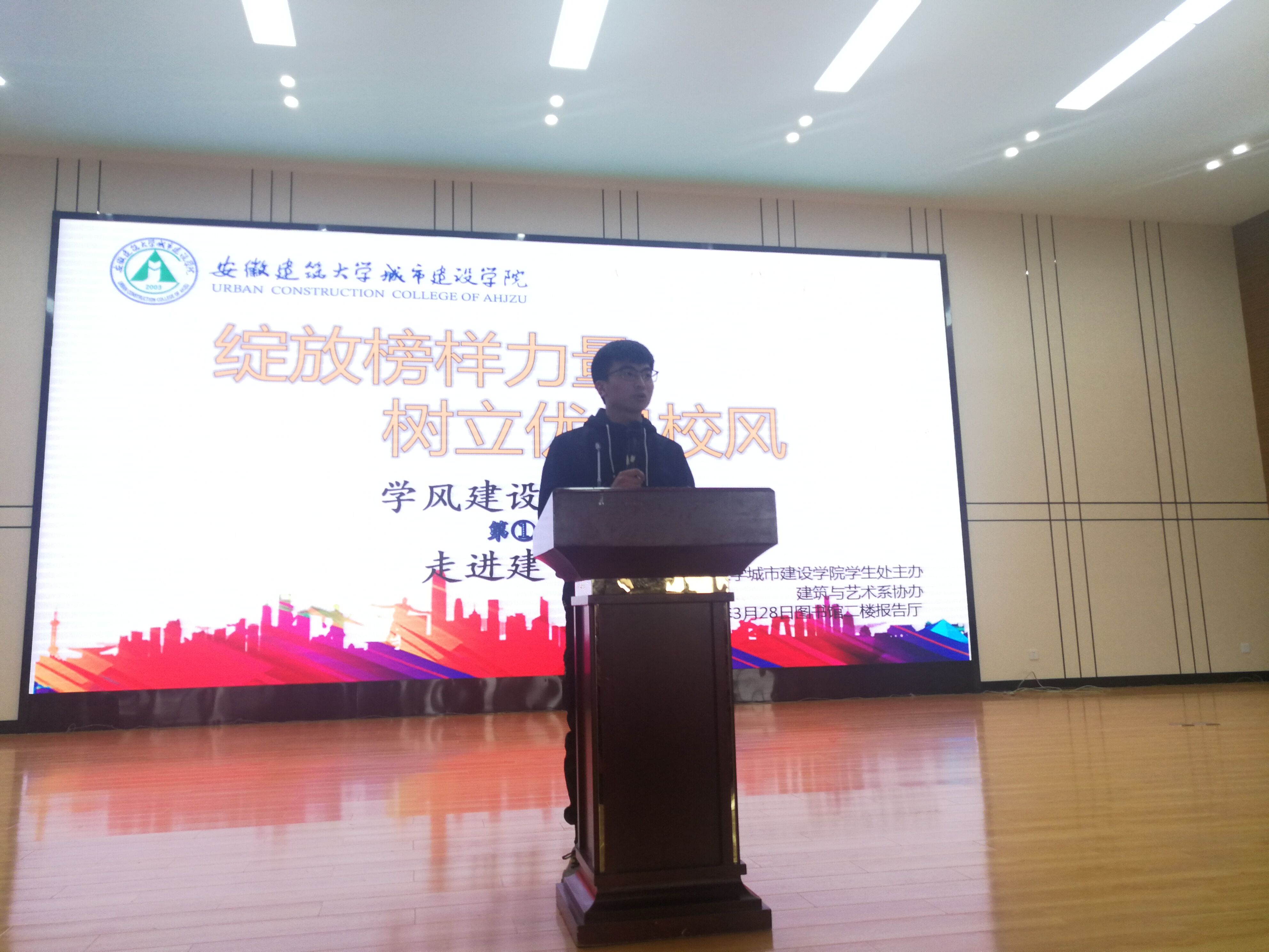 3月28日,安徽建筑大学城市建设学院“绽放榜样力量,树立优良校风”学风建设宣讲活动在图书馆二楼报告厅圆满举行,学生处、建筑艺术系老师,宣讲团成员、建筑艺术系学生参加了本次活动。5位同学为建艺系的学弟学妹们分享了他们的学习、生活经历,本场宣讲会由高宇老师主持。