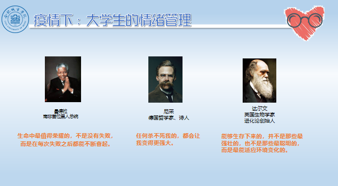 此次讲座旨在帮助学生对自己进行正向思维引导,树立责任意识、自主意识,认识到封闭管理既是为他人也是为自己的双赢措施,自发地、自主地选择认同封闭管理:不是被“封在”学校,而是为了疫情的防控,用实际行动做出自己的贡献,减少自己的抵触情绪。与此同时,希望同学们能够严格遵守学校的防疫制度,理性坦然地应对疫情,看到国家、学校为防控疫情所作出的努力和已取得的成果,相信党和政府能够有效化解危机,积极学习防疫技巧,做好自我防护,认真学习,自我充实提高。